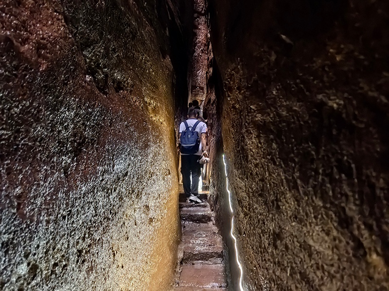 从虎啸岩出来,大家又来到一线天。狭窄的石缝中,仅容一人侧身而过,抬头仰望,那一线天光洒下,神秘又震撼,员工纷纷感叹大自然的鬼斧神工。