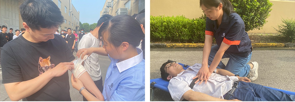 2、 医疗救护实操演练:针对皮外伤伤员,进行简单的伤口包扎,针对呼吸停止的伤员,进行心肺复苏术抢救。