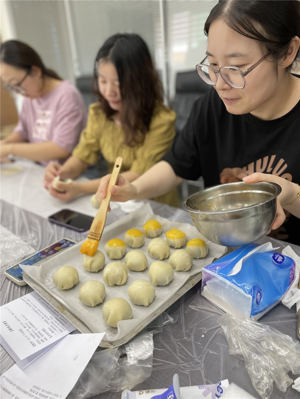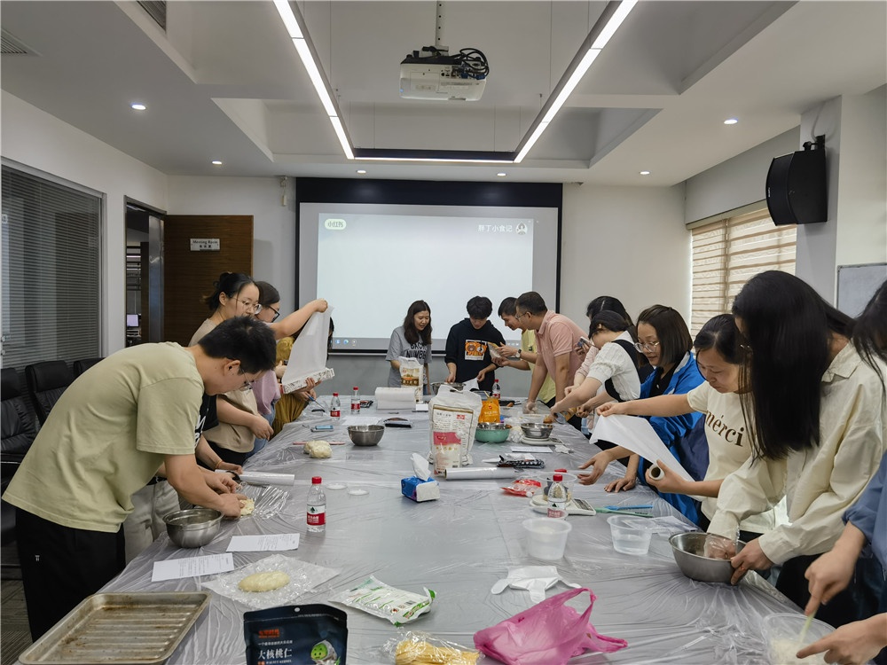 本次活动内容为制作苏式月饼和蛋黄酥。参与活动的职工们一起动手制作馅料、油皮和油酥,体验亲手制作月饼的乐趣。醒面等待时,大家互相交流制作心得,各自分享中秋趣事,活动室充满欢声笑语。
